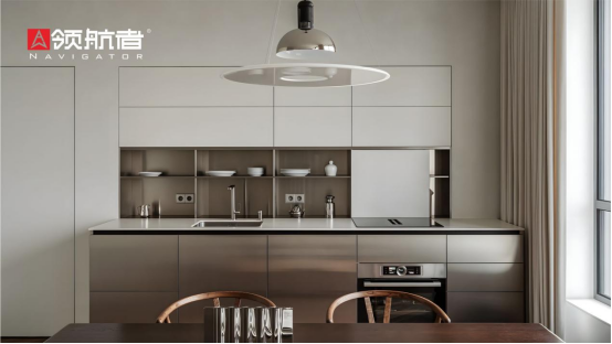北歐風的“極簡”藏在領航者廚房定制柜的功能里,廚房一體化柜體外側平整,內里卻藏“收納魔法”——封閉柜可存放換季或不常用的廚房雜物,讓空間遠離雜亂;開放格用來放置常用餐具,拿取格外順手;高柜的設計則方便取用深處物品,每一處空間都能被高效利用,真正做到功能“藏而不露”,令廚房既有著簡約大氣的視覺效果,又能充分滿足實用的收納與操作需求。
