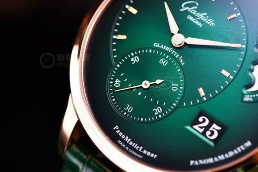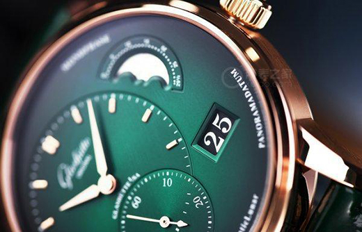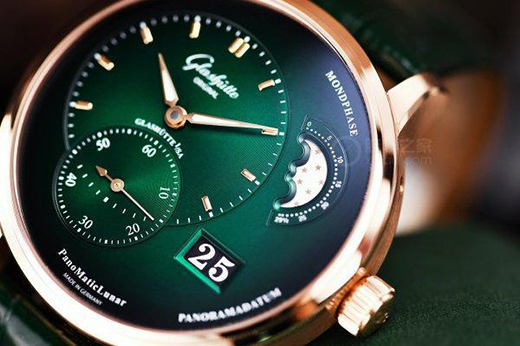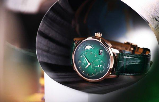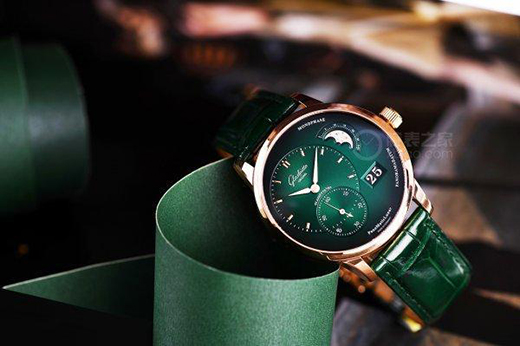 綠色,是生機、是期望,它總是能讓我們想到美好的事物。在制表上,這幾年綠表非常流行,綠色讓腕表呈現出了與眾不同的氣質。這次我們拿到了格拉蘇蒂原創(chuàng)全新的偏心月相腕表紅金款,其實之前格拉蘇蒂原創(chuàng)就已經推出過了兩款不同表帶的精鋼款。作為中國首發(fā),今年的這一款以紅金材質搭配森林綠色表盤,色彩更加鮮明濃烈。