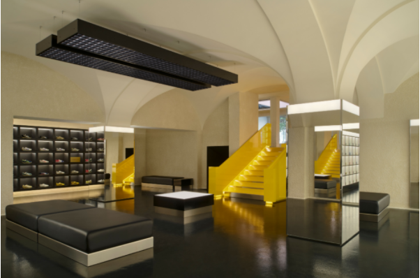 門店內(nèi)部以品牌標(biāo)志性黃色為主色調(diào),明亮的色彩與這座始建于 1856 年的私人住宅——巴黎旅行者大樓(The Travellers Paris)的優(yōu)雅歷史韻味相得益彰。設(shè)計(jì)中融入了清水混凝土、打光的墻面和鮮艷的黃色玻璃等元素,造就了極具吸引力的建筑景觀??臻g的中心是以明亮的黃色玻璃圍裹的陳列柜,展現(xiàn)的是品牌的最新系列產(chǎn)品,為顧客帶來身臨其境的體驗(yàn)。